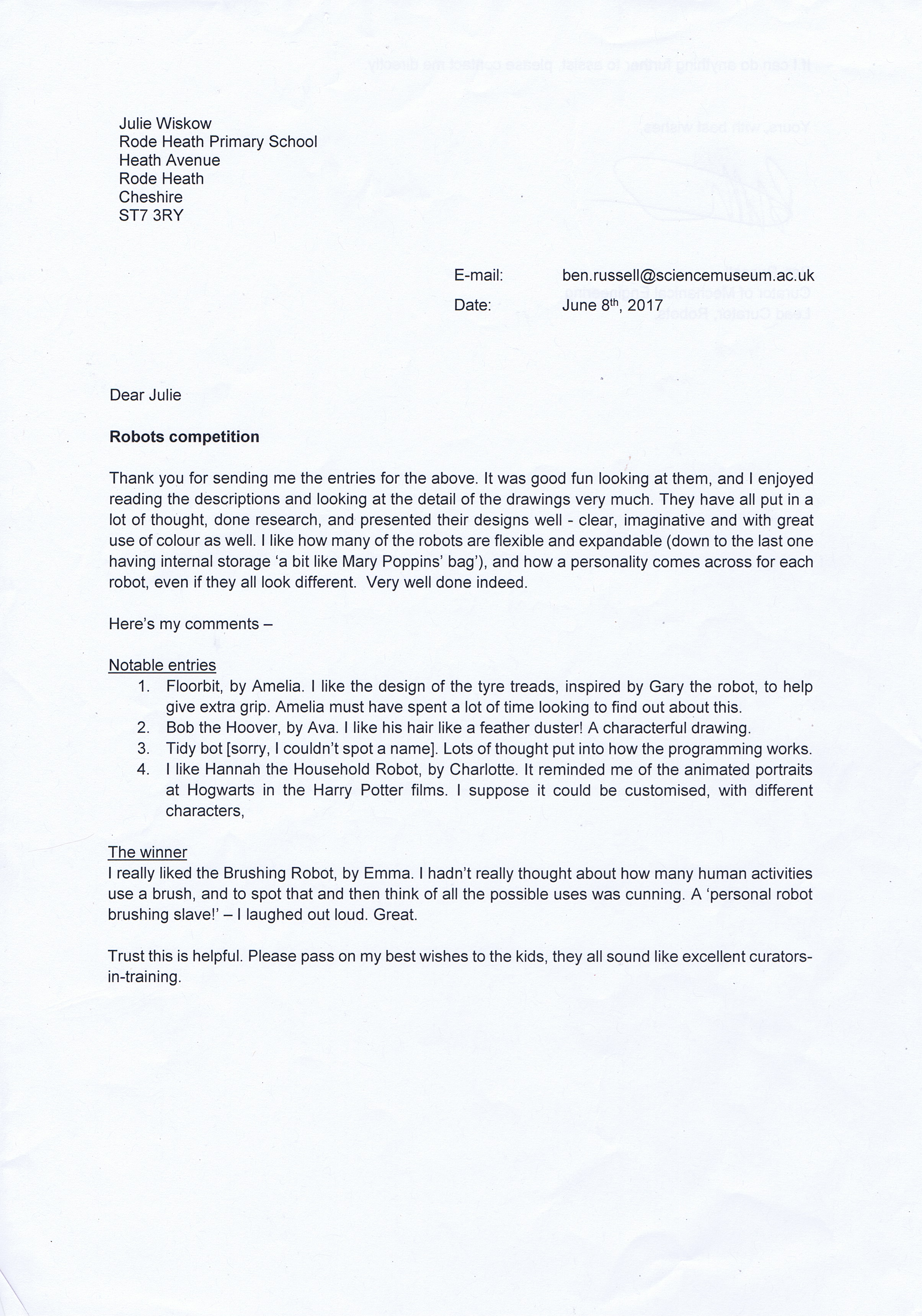 Letter from Science Musuem pg1